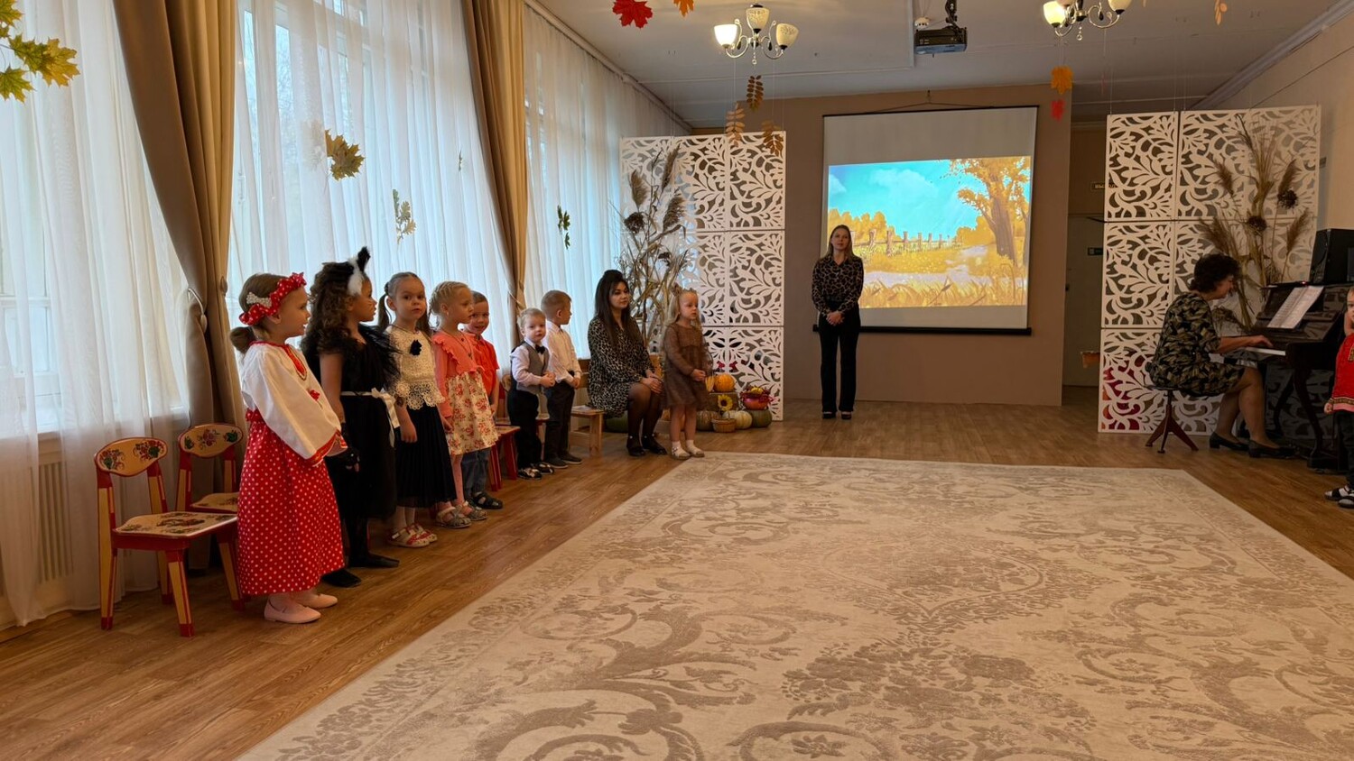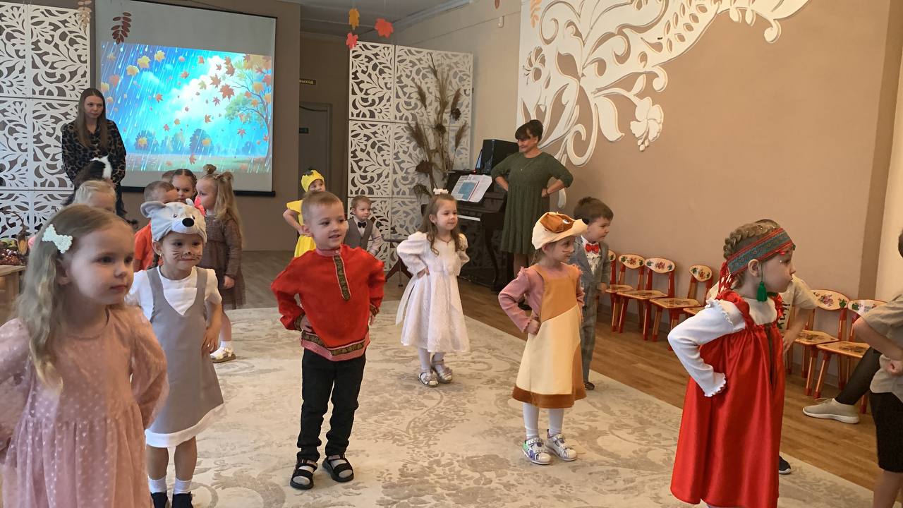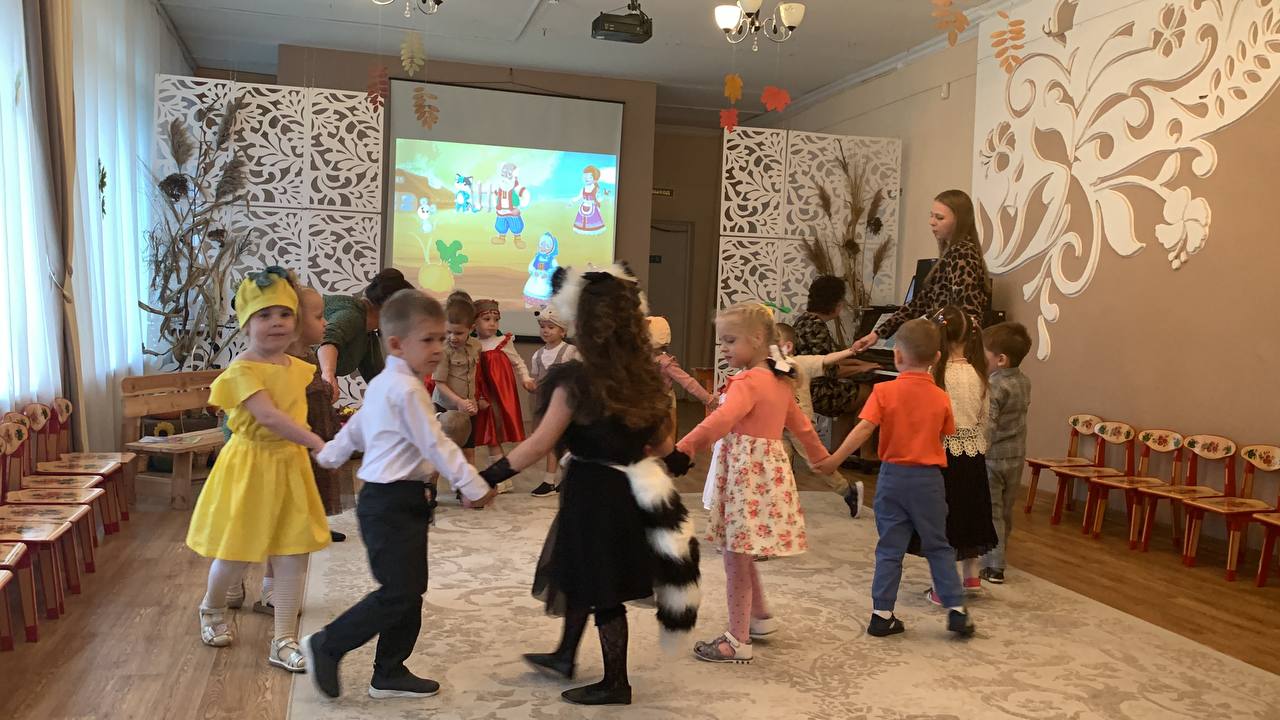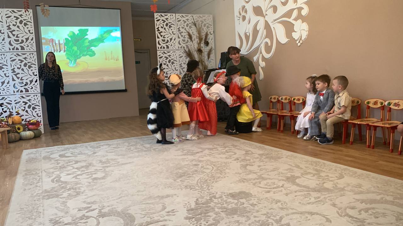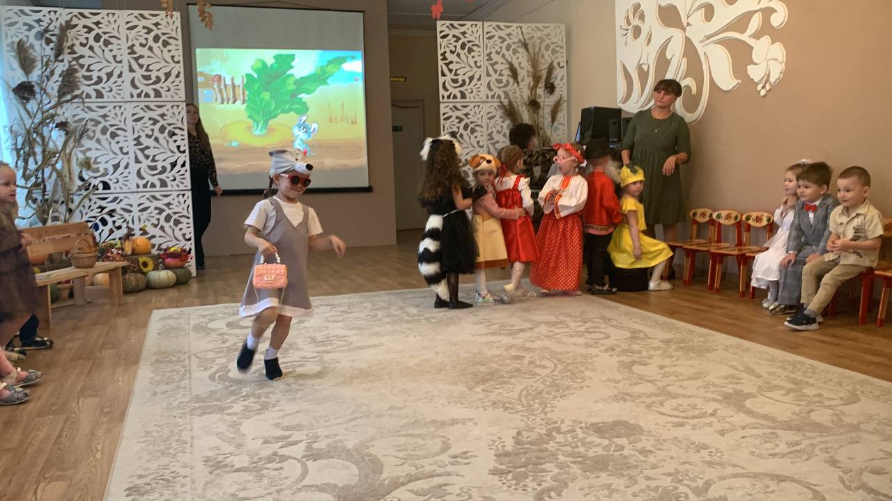 Осенний праздник в средней группе «Солнышко» начался с радостных улыбок детей и аплодисментов родителей. Ребята вошли в красиво украшенный зал. Вот и осень к нам пришла, в огород нас позвала, где выросла большая репка. Утренник прошел по р.н.с. «Репка». Дети с большим интересом погрузились в любимую сказку. Они с увлечением перевоплощались в сказочных героев: дедушку, бабушку, внучку и всех животных. Дружно, весело все вместе вытянули репку. Наши маленькие артисты с блеском справились со своими ролями. Это не только увлекло ребят, но и позволило им раскрыть свои творческие способности. Но на этом праздник не закончился. Дети пели звонкие песни об осени, танцевали, рассказывали трогательные стихи и с удовольствием участвовали в веселых играх. Каждый ребенок вложил частичку своей души в этот праздник, и это было видно по их сияющим глазам!